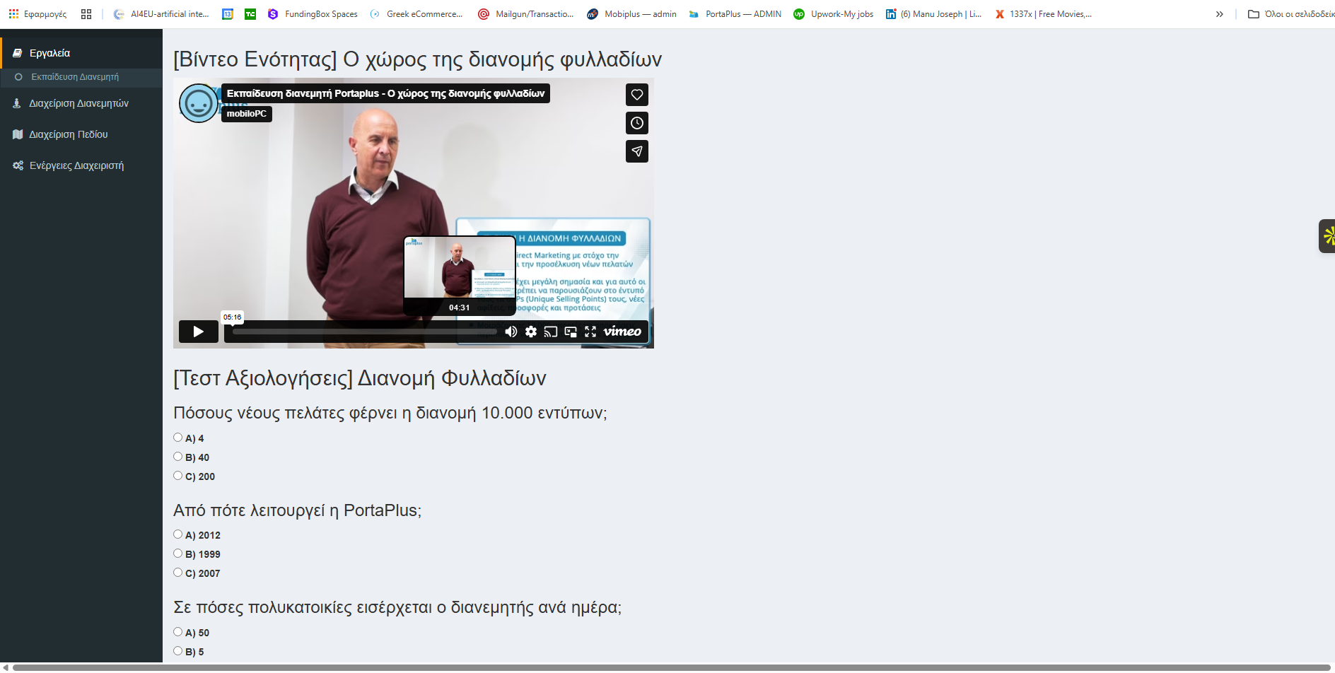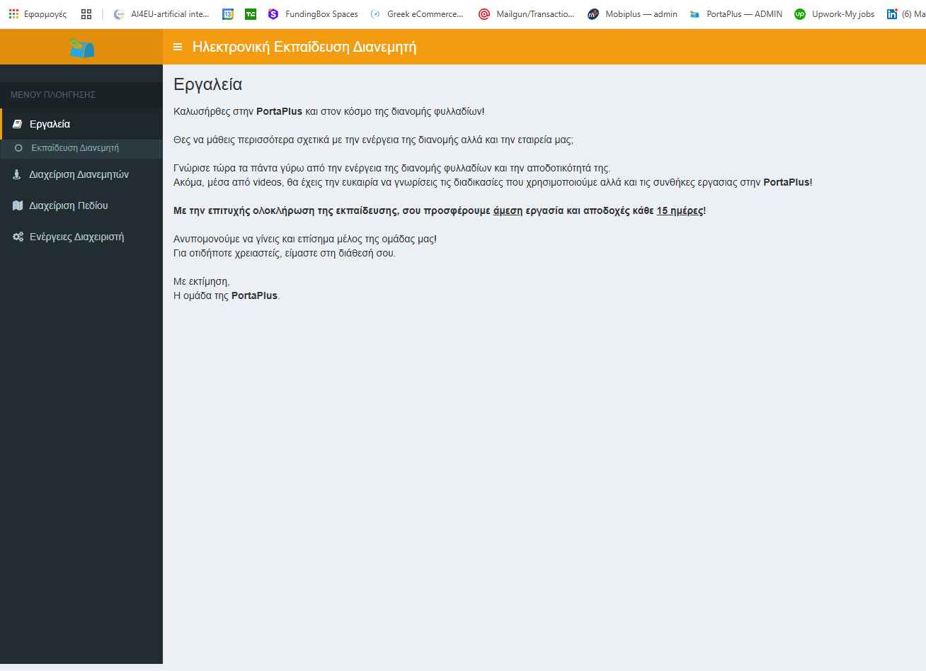 Χρησιμοποιούμε το εξελιγμένο LMS (Learning Management Software) Portaplus v2.0.1, μια ψηφιακή πλατφόρμα όπου οι διανομείς πρέπει να συνδεθούν για να ξεκινήσουν την εκπαίδευσή τους.